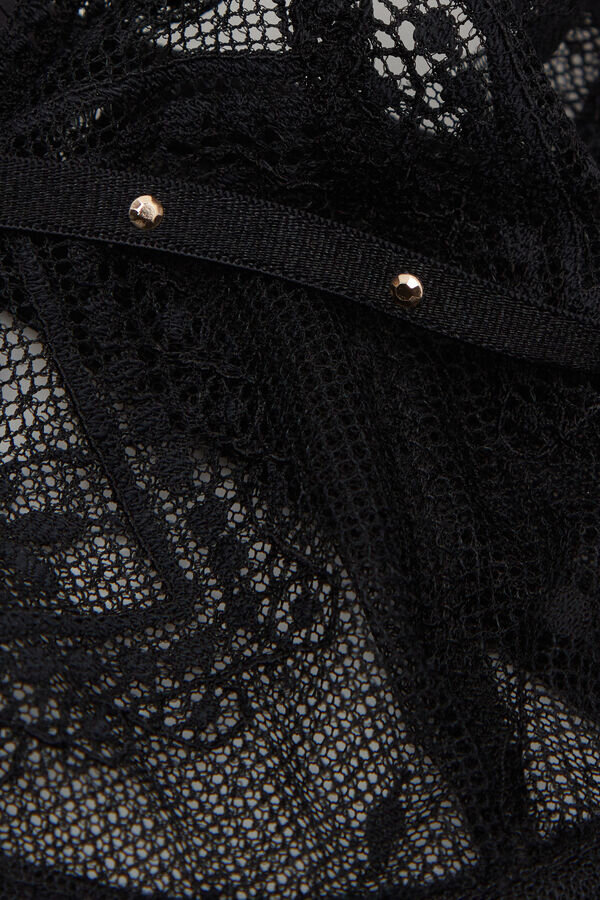 Halbmond-Balconette-BH aus weicher Stretch-Spitze mit geometrischem Motiv, kombiniert mit elegantem gepunktetem Tüll. Mit elastischem Motiv am Dekolleté und goldenen Nieten an den Trägern. Kleine Schleife in der Mitte des Brustbereichs mit goldener Verzierung. Bequem und komfortabel, sorgt er auch bei kleinerer Oberweite für einen sehr sinnlichen und faszinierenden Effekt.