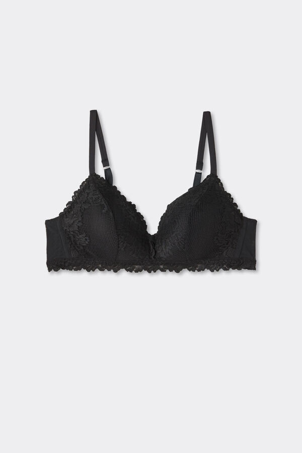 Tiziana Triangel-BH ohne Bügel mit leicht gepolsterten Cups und seitlichen Stäbchen, die den Busen sanft formen. Er ist aus raffinierter und eleganter Stretch-Spitze gefertigt, die je nach Version mit farblich abgestimmten oder kontrastierenden Blumenstickereien verziert ist. Die Träger sind mit Mikrofaser gefüttert und im Rücken verstellbar. Dieser BH formt die Brust sanft und bietet leichten Halt.