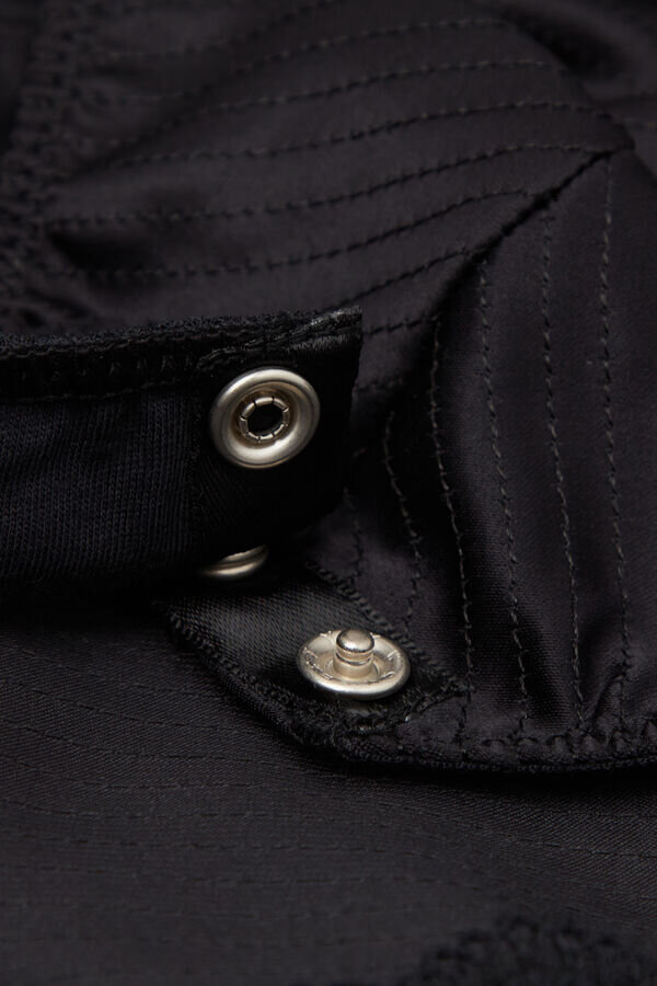 Lace Bodysuit mit Satinbesatz und raffinierten Nähten, die an einen eleganten Retro-Stil erinnern. Der Ausschnitt wird durch einen V-förmigen Bügel betont und die Rippung sorgt für einen Bustier-Effekt. Perfekt, um allein oder unter einer Jacke getragen zu werden.