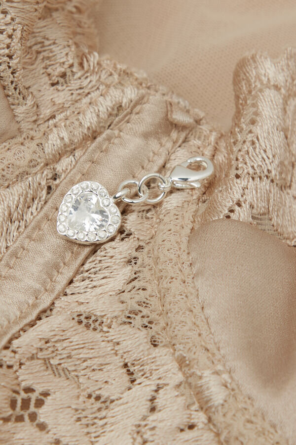 Bodysuit aus Stretch-Seidensatin, kombiniert mit weichem Tüll und verziert mit romantischer, floraler Stickerei. Herzförmiger Anhänger mit Strasssteinen in der Mitte des Brustbereichs. Wunderschön sowohl solo als auch unter einer Jacke zu tragen.