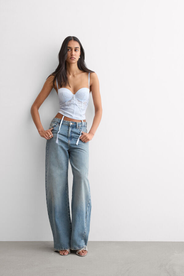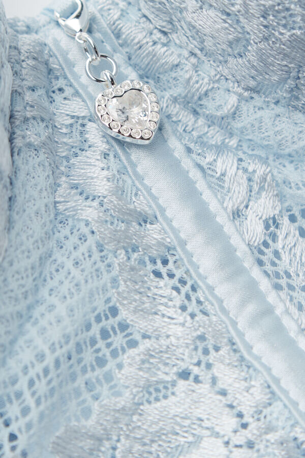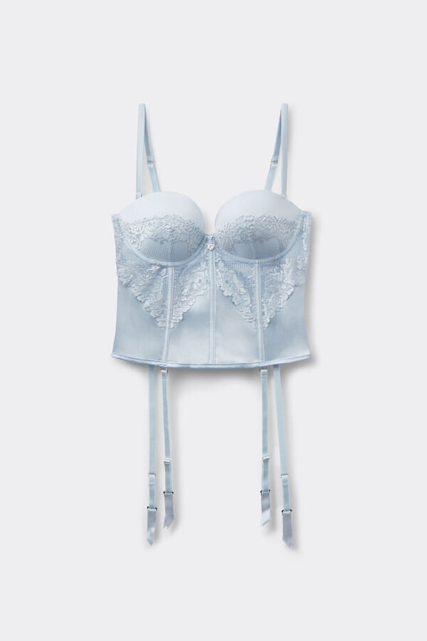 Raffiniertes und elegantes Bustier aus Stretch-Seidensatin, verziert mit romantischer, floraler Stickerei. Herzförmiger Anhänger mit Strasssteinen in der Mitte des Oberteils. Die Rippen und Tüll-Einsätze sorgen für einen Bustier-Effekt, sodass es sich perfekt solo oder unter einer Jacke tragen lässt.