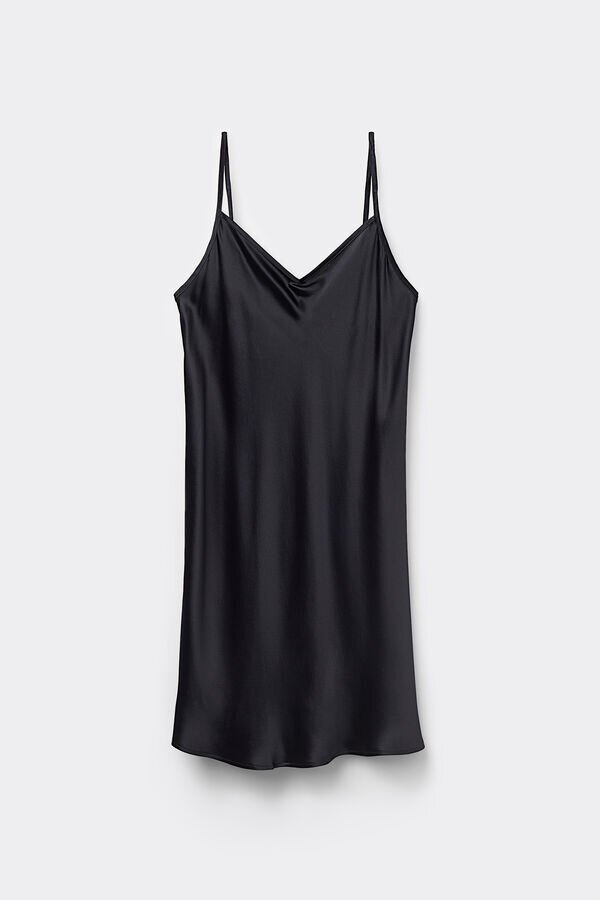 Glatter Seidenunterrock mit verstellbaren, schmalen Trägern und dezentem V-Ausschnitt. Perfekt unter Kleidern zu tragen für eine elegante Silhouette. Das Model ist 1,75 m groß und trägt Größe S.
