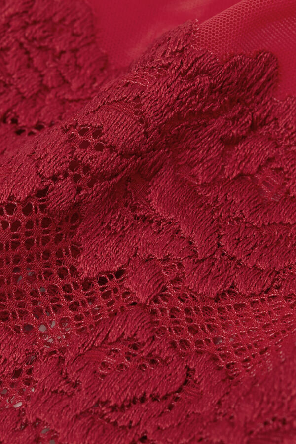 Babydoll aus sinnlicher, transparenter Spitze und Tüll. Je nach gewählter Farbe kann die Spitze kontrastfarben oder ton-in-ton sein. Vollständig verstellbare elastische Träger. Reguläre Passform.