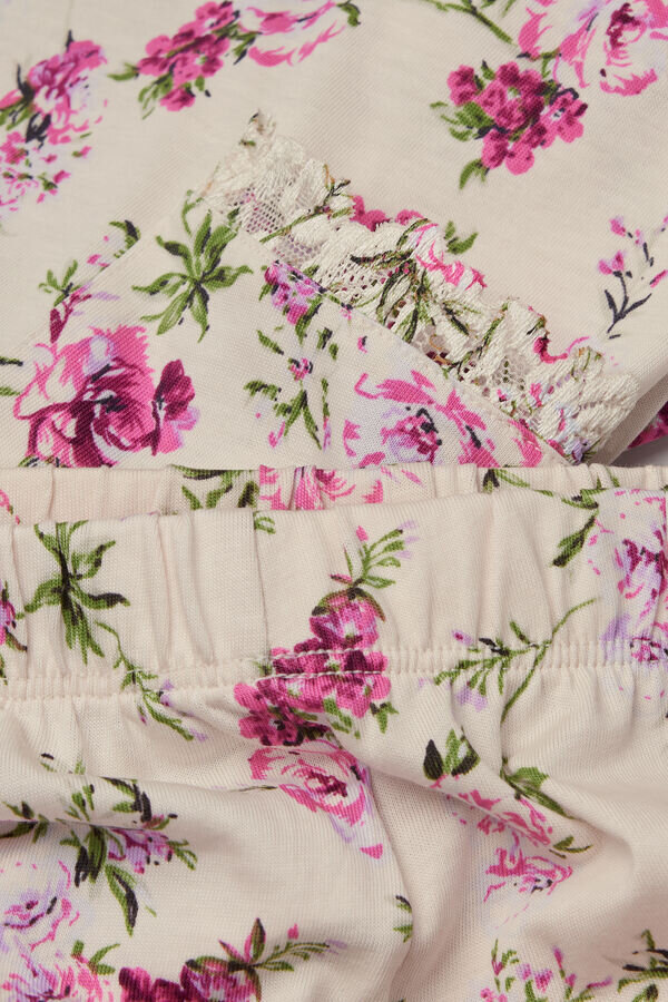 Langer Pyjama aus weicher und bequemer hochwertiger Baumwolle mit romantischem und farbenfrohem Blumenprint. Die Tasche am Hemd ist mit einer Spitzenrüsche verziert.