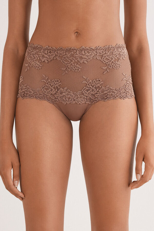 Hoch geschnittener Brazilian-Slip aus Spitzenrüschen mit weichem Mikrofaser-Unterteil. Je nach gewählter Farbe kann die Spitze kontrastfarben oder ton-in-ton sein. Hoch geschnittene Seiten. Innenzwickel aus 100 % Baumwolle.