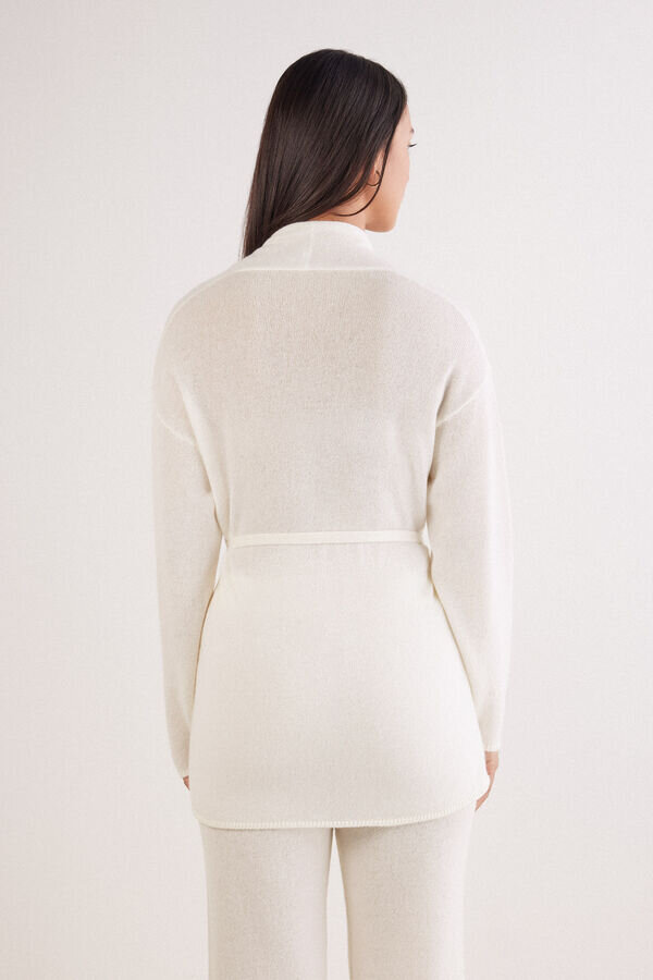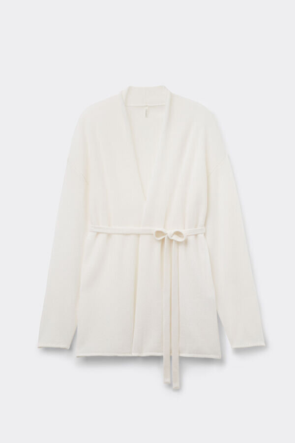 Strickjacke aus reinem Kaschmir mit weicher Textur und bequemer, kuscheliger Passform. Dank des Gürtels sehr vielseitig und auf verschiedene Arten tragbar. Kann auch als warmer, kuscheliger Morgenmantel verwendet werden.