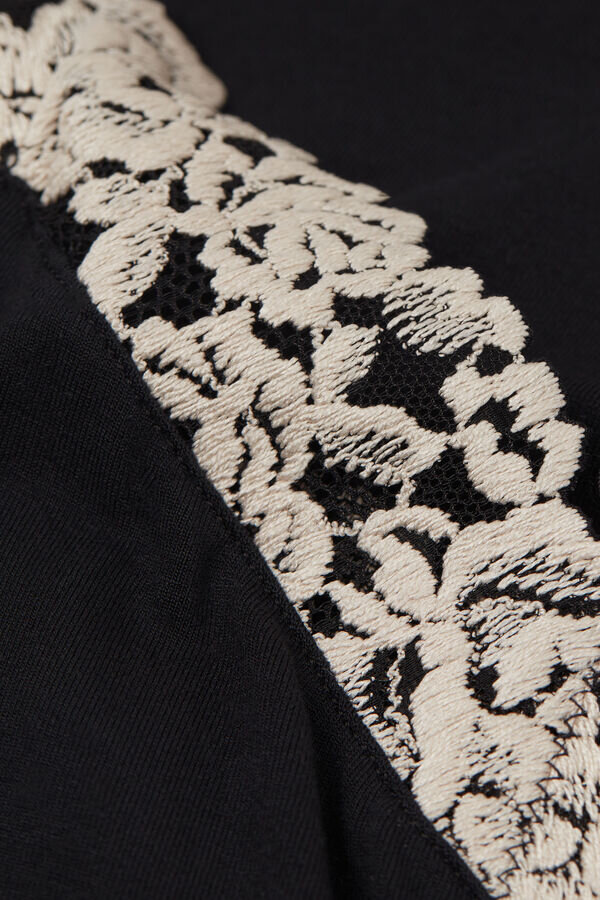 Top mit V-Ausschnitt aus Modal und verziert mit einer Spitzenrüsche. Je nach gewählter Farbe kann die Spitze kontrastfarben oder ton-in-ton sein. Dünne Träger mit Micromodal-Futter.