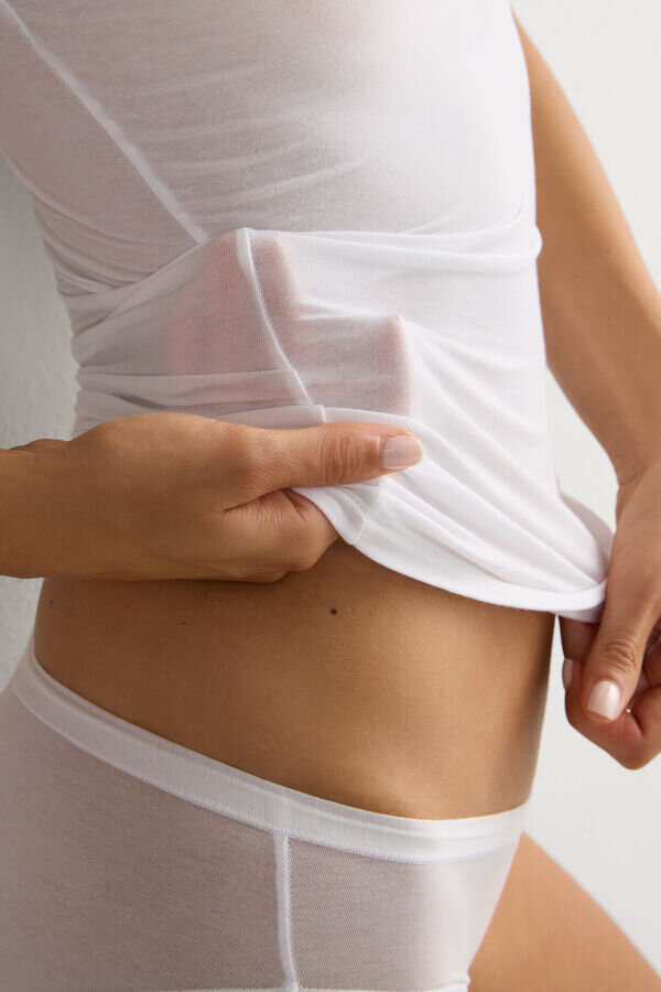Top aus leichter und weicher, ultraleichter Stretch-Baumwolle mit leicht transparentem Effekt. Schmiegt sich sanft an den Körper an und ist ideal für alle, die besonders an heißen Tagen ein besonders frisches und bequemes Kleidungsstück suchen.
