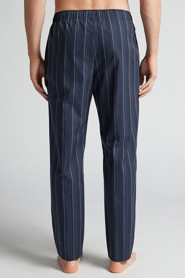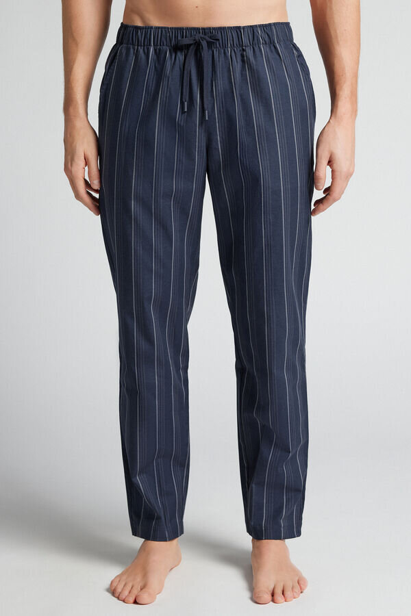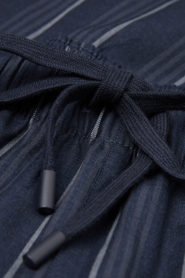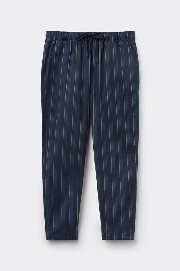 Lange Hose aus blauem Baumwollstoff mit weißen Streifen. Perfekt für die Nacht oder zum Entspannen zu Hause.