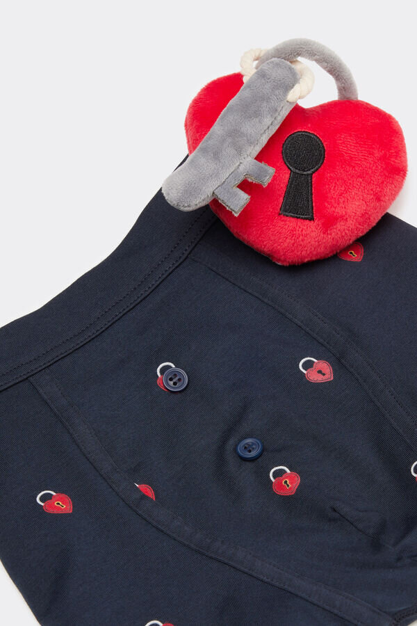Herren-Boxershorts aus weicher, hochwertiger, leicht dehnbarer Baumwolle mit durchgehendem Padlock-Herz-Print. Ein romantisches Padlock-Herz mit einem Plüschtier in Form eines Schlüssels ist am Beutel befestigt.